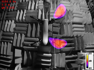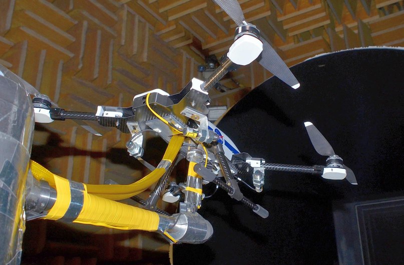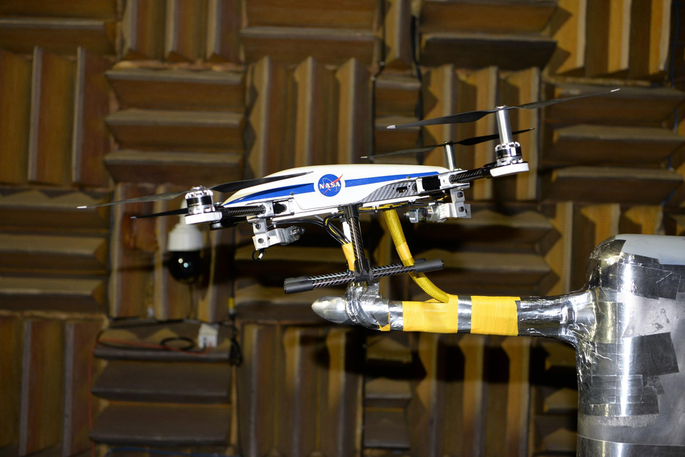 A A A Identification and Reduction of Interactional Noise of a Quadcopter in Hover and Forward Flight Conditions Nikolas S. Zawodny 1 Nicole A. Pettingill 2 Christopher S. Thurman 3 Aeroacoustics Branch NASA Langley Research Center Hampton, VA 23681 ABSTRACT Advanced Air Mobility is a vision for a safe, accessible, and sustainable aviation system to transport people and cargo between places not served by traditional aviation. With this emerging transportation industry, there is motivation to characterize the noise of vehicles to determine their potential impacts on the community. An experimental testing campaign was conducted on a representative model of a small unmanned aircraft system in the NASA Langley Low Speed Aeroacoustic Wind Tunnel as a continuation of a previous testing campaign. The goals of the current test are to identify sources of interactional noise as well as to test custom-designed rotors and noise reduction devices. The tested noise reduction methods involve increasing the vertical distances between the rotors and the vehicle airframe as well as between the forward and aft rotor disk planes. These methods are intended to reduce rotor-airframe interaction noise in hover and fore-aft rotor wake ingestion noise in forward flight. A phased microphone array is also utilized to identify the locations of prominent noise generation for the di ff erent vehicle configurations in forward flight. Elevation of the rotors from the vehicle airframe yielded nearly 8 dBA overall noise reduction in forward flight, while yielding up to 4 dB reduction in overall tonal levels for one of the rotors in hover. 1. INTRODUCTION Small Unmanned Aircraft Systems (sUAS) and Urban Air Mobility (UAM) aircraft are key components of the emerging Advanced Air Mobility (AAM) aviation industry. UAM aircraft are planned to perform passenger transport missions up to 120 km (75 miles) around metropolitan areas, while sUAS vehicles are expected to perform local missions including aerial imaging and small cargo delivery. [1] One aircraft configuration that is common to both of these vehicle classes is the multicopter. An overwhelming majority of sUAS that have been documented by the FAA are of the multicopter variety.In addition, the NASA Revolutionary Vertical Lift Technology (RVLT) project has overseen the development of a range of UAM vehicle concepts, including a six-passenger quadrotor vehicle. [2] Furthermore, previous experimental investigations have found that sUAS vehicle sounds can be more annoying than similar amplitude sounds generated by ground vehicles. [3,4] Therefore, characterization of the noise sources of these vehicles is important so that noise reduction opportunities can be identified and implemented. 1 nikolas.s.zawodny@nasa.gov 2 nicole.a.pettingill@nasa.gov 3 christopher.thurman@nasa.gov a slaty. inter.noise 21-24 AUGUST SCOTTISH EVENT CAMPUS O ¥, ? GLASGOW Previous experimental testing of a quadcopter in an acoustic wind tunnel environment revealed vehicle performance and acoustic data that agreed well with flight test measurements of the same nominal vehicle. [4, 5] This prior investigation identified noise characteristics in both hover and forward flight that were believed to originate as a result of complex aerodynamic interaction mechanisms. Specifically, these mechanisms included tonal harmonic excitations in hover believed to be due to rotor-airframe interactions, [6] as well as considerable increases in broadband noise for fore-aft rotor pairs operating in forward flight believed to be due to front rotor wake ingestion by the aft rotor. [7] The current testing campaign seeks to identify these noise source mechanisms and implement rudimentary noise reduction mechanisms. 2. TECHNICAL APPROACH 2.1. Facility and Test Setups The Low Speed Aeroacoustic Wind Tunnel (LSAWT) is an open-circuit free jet wind tunnel that is currently configured for a freestream Mach number range of 0 . 045 ≤ M ∞ ≤ 0 . 143 and is reconfigurable to an upper end capability of M ∞ , max = 0 . 32. More details of the facility capabilities can be found in Reference 8. A summary of the test setup is depicted in Figure 1. As shown in Flow Management System Microphone Array Flow Collector Model Test Stand (MTS) Tunnel Inlet Nozzle Upstream Acoustic Baffles Downstream Acoustic 4000 hp Fan Driver Unit (a) Baffles Phased Array Flow Laser Tachometer Inlet Nozzle Load Cell Flow (b) (c) (d) Figure 1: LSAWT and model test stand setups: (a) Rendered cut-away illustration of the LSAWT, (b) phased and linear microphone arrays, (c) quadcopter mounted on the MTS, (d) on-vehicle measurement devices. Figure 1(a), the anechoic test chamber is centrally located along the length of the facility, and it is acoustically treated with fiberglass wedges down to a cut-o ff frequency of approximately 250 Hz. Two acoustic arrays were utilized in this study: a streamwise linear array of 28 B&K type 4939 free-field microphones, and a commercially available phased microphone array (OptiNav ACAM 120). As shown in Figure 1(b), the linear microphone array is located along one of the facility upper corners in the streamwise direction, and the phased array is in an overhead position, just outside of the tunnel shear layer. The purpose of the linear array is to gather acoustic spectra and directivity information, while the phased array allows for noise source localization via beamforming. Figures 1(c) and 1(d) provide close-up views of the quadcopter installed on the LSAWT model test stand (MTS). Figure 1(d) shows the on-vehicle measurement instrumentation as well, which consist of an ATI-IA Mini40 multiaxis load cell and a total of four laser tachometers (one for each rotor) for tracking motor rotation speeds, all located on the underside of the vehicle airframe. More details of this instrumentation can be found in Reference 5. The test article in this study is the same Straight Up Imaging (SUI) Endurance quadcopter model hardware tested