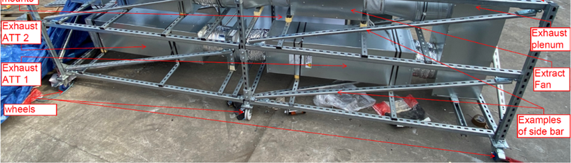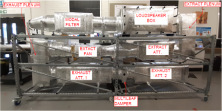 A A A Experimental Acoustic Testing Of Alternative Ventilation Ducts Zekic, Suzana 1 , Imtech Engineering Services London South Bank University 20 Kingston Road, Staines-upon-Thames 103 Borough Rd Middlesex TW18 4LG London SE1 0AA Gomez-Agustina, Luis 2 ; Aygun, Haydar; Chaer, Issa London South Bank University 103 Borough Rd, London SE1 0AA ABSTRACT Ducts of alternative materials to galvanised steel, are widely employed in residential buildings’ mechanical ventilation systems in a bid to comply with the conservation of energy regulations in circumstances that prevent the use of natural ventilation. The noise transfer predictions of systems with alternative ducts are still being based on data for galvanised steel due to the lack of acoustic performance data of alternative ventilation ducts tested in controlled conditions. To close this knowledge gap, a test rig was designed and built based on the test set up defined in ISO 7235. Alternative ventilation ducts and associated 90º bend samples were acoustically tested in controlled laboratory conditions utilising customized test rig developed to suit typically small duct profiles of alternative ventilation ducts. Test samples were tested using two methods: the substitution principle as outlined in BS EN ISO 7235 (2009) as well as applying a novel “zero substitution” conceptual approach. The preliminary results of the “zero substitution” approach tests show indication of its validity. 1. INTRODUCTION Ducts of alternative materials to galvanised steel, are widely employed in residential buildings’ mechanical ventilation systems in a bid to comply with the conservation of energy regulations [1] in circumstances that prevent the use of natural ventilation. The noise transfer predictions of systems with alternative ducts are still being based on data for galvanised steel due to the lack of acoustic performance data of alternative ventilation ducts tested in controlled conditions [2]. To close this knowledge gap a programme of experimental tests was devised, involving the re- view of existing and relevant test procedures [3] creation of a dedicated test rig and the implementa- tion of a series of laboratory based measurements. This paper aims to inform on progress to date on the experimental testing processes implemented and the conceptual stage of a novel test procedure approach. 1 suzana.zekic@imtech.co.uk 2 gomezagl@lsbu.ac.uk inter.noise scone ROSE DODD as 2. EXPERIMENTAL TESTING OVERVIEW Samples of ventilation ducts of alternative materials (plastic and polystyrene) of straight and as- sociated 90º bend configurations were acoustically tested in controlled laboratory conditions. The samples were representative of ducts employed in the residential ventilation industry. Sound transmission loss and aerodynamic performance were investigated by means of experi- mental measurements utilising the substitution principle as outlined in ISO 7235 [4] test procedure. The conceptual stage of a novel and alternate test procedure named as “zero substitution” was developed and preliminary validation tests were undertaken. A custom-built portable test rig was constructed to enable a comprehensive set of investigative tests in an acoustics laboratory. 3. STANDARDISED TEST PROCEDURE ISO 7235 This international standard provides guidance for laboratory testing procedures for determining the insertion loss, flow noise and total pressure loss for ducted silencers and air-terminal units uti- lizing the substitution principle. Following this method, the sound pressure levels (SPL) of the transmitted sound source are firstly obtained for the test sample and then the sample is replaced by the substitution piece and the SPL are measured again. The arithmetic difference between the two measurements represents the insertion loss of the tested sample. The measurements of the SPL can be made in a reverberation room, induct - in the test duct before and after the tested sample and also in the free field. The test set up that follows the aforementioned standard as found at Lindab [5] and other testing facilities [6], [7], has elements on a large scale permanently fixed across many rooms allowing test- ing of ducted silencers and air-terminal units of large sizes. In the UK and mainland Europe it is the main testing procedure to obtain the performance of the passive type of silencers used in ventilation systems. 4. THE TEST RIG The design of the test rig was based on the test set-up described in the ISO 7235 [4]. The alterna- tive ventilation ducts typically used within residential ventilation have small profiles such as the rectangular ducts 220x90mm, 204x60mm, and the circular ducts with 150mm diameter and 125mm diameter meaning that a smaller, scaled down version of the traditional test set up would be better suited for conducting acoustic testing of the same. Furthermore, small test rig elements permitted the built up of the test rig in a compact as well as portable format. The initial idea of having all rig elements in a long horizontal in-line format was abandoned for the vertical stack up formation (Figure 1). This compacted option, compared to the horizontal in- line approach, reduced floor footprint, prevented movement of individual test rig elements, reduced the number of uncertainty factors and provided good accessibility for the monitoring of different parts and sections. inter.noise scone ROSE DODD as 1500 225 1775, Figure 1 Test rig vertical stack up design side view The test rig frame was made from 40x40mm Unistrut bars to keep the weight of the rig as low as possible. Rubber pads were installed between every bar connection for vibration isolation. The addi- tional corners and reinforcement sidebars were added to enhance the strength and sturdiness of the frame and minimize unwanted re-radiated noise emissions. Wheels were installed at each corner and in the middle sections of the rig frame to enable easy movement of the entire rig. Flexible co