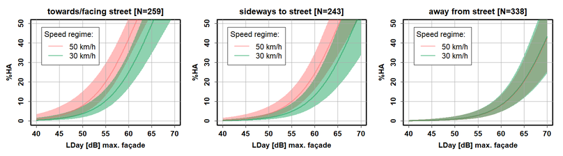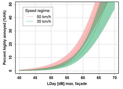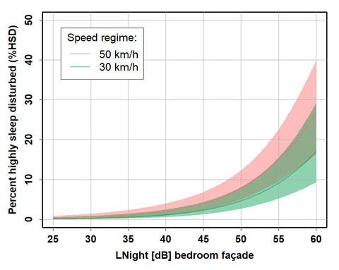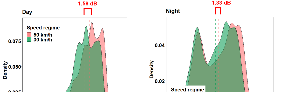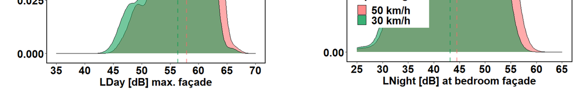 A A A Effects of traffic speed reduction interventions on noise-induced annoyance and self-reported sleep disturbances: a longitudinal study in Zurich Mark Brink Federal Office for the Environment, 3003 Bern, Switzerland Simone Mathieu and Stefanie Rüttener City of Zurich, Department of Health and Environment, 8001 Zurich, Switzerland ABSTRACT For the purpose of evaluating acceptance and effects of permanent speed reductions on noise level, noise annoyance and self-reported sleep disturbance, we surveyed about 1300 randomly sampled inhabitants, before and after a speed regime changeover from 50 km/h to 30 km/h along 15 small and mid-sized city streets in Zurich. Concurrently, individual noise exposure calculations based on traffic counts and on-site speed measurements were carried out. The results show a decrease of road traffic noise levels at the loudest façade point by an average of 1.6 dB during the day and 1.7 dB at night, a significant decrease of noise annoyance and of self-reported sleep disturbances as well as a significant but moderate increase of the perception of road safety. Most importantly, the exposure-response relationships for annoyance and sleep disturbance were shifted towards lower effects in the 30 km/h condition by, depending on receiver point, between about 2 and 4 dB during the day and about 4 dB at night, indicating lower effects at the same average level. We conclude that besides the lower average level alone, additional factors related to the lower driving speed must play a role in the reduction of annoyance and sleep disturbance. 1 INTRODUCTION From a public health perspective, road traffic is one of the most important causes of injuries and non-communicable diseases – including those caused by air pollution and noise [1]. The adverse health effects of road traffic are even greater in urban areas, where both population and traffic densities are high and general mobility demands are increasing, partly as a result of projected population and job growth. As Switzerland's most populous city, Zurich is particularly affected by this problem. The legal exposure limits for road traffic noise are exceeded on a network of about 230 km length. In order to improve the health and quality of life of the city's residents and, above all, as a means of reducing noise, the city of Zurich has for several years pursued the goal of reducing road traffic noise in a first step by reducing the speed limit from 50 km/h to 30 km/h on parts of the street network. This is a cost-effective noise abatement measure with an estimated noise reduction potential of up to 3 dB for the average level (Leq) and up to approx. 5 dB for the maximum level [2, 3]. In recent years, the city has signalized a 30 km/h speed limit on almost 40 km of the street network with iced ral inter.noise mee DOOD excessive noise exposure. For the purpose of evaluating this measure, an empirical longitudinal survey and corresponding individual exposure calculations were carried out in the city in the years 2017-2020 among about 1300 randomly contacted residents living on a total of 15 street sections where the change from speed limit 50 km/h to speed limit 30 km/h took place in the corresponding time period. A before-after comparison was realized by interviewing the same persons twice, about one to two years apart. The study goals were to investigate whether and to what extent the speed reduction led to a reduction in average noise exposure, noise annoyance and self-reported sleep disturbance due to noise, as well as an increase in the perceived road safety in the respective street. In addition, it was investigated how exposure-response relationships differ between the 50 km/h and 30 km/h regime. The study focused in particular on the question of whether the (hypothesized) reduction in annoyance and noise-induced sleep disturbance as a result of the speed reduction can be explained solely by the achieved reduction in the average noise level or possibly also by other/additional factors. 2 METHODS The study was carried out between 2017 and 2020 on 15 street sections in the city of Zurich that in this period were affected by the changeover from 50 km/h to 30 km/h speed limit. On these street sections, one randomly determined resident per household (N=3732) were contacted by post before the changeover (fill-out date of questionnaire on average 95 days before) and asked to complete a questionnaire on their perception of street traffic noise in their street. Respondents were then contacted again after the changeover (fill-out date of questionnaire on average 393 days after) and asked to complete another questionnaire (with largely the same items/questions). The participants were asked about the noise pollution they experienced and about their sleep disturbances in relation to a retrospective period of 6 months (before the questionnaire was completed, and as opposed to the usual 12-month period according to the ICBEN recommendation). For the after-survey, only persons who had returned the questionnaire of the previous survey (N=1311) were again contacted. This procedure allowed for a pairwise before-and-after comparison of responses, in other words, a repeated measures statistical design (Figure 1). Figure 1: Study design with “before”-survey during the previous 50 km/h regime (orange bar) and “after”-survey with the same persons after the changeover to 30 km/h (blue bar) (in the after-survey, only those persons were contacted who had participated in the before-survey). A four-page paper and pencil questionnaire was used for the survey. The questionnaire was entitled "Survey on the perception of road traffic noise among residents of the city of Zurich" and was sent out together with a cover letter. A before and an after version of the questionnaire was created in each 6 months 6 months i, —— 60) [before 1130) [after | referring time period referring time period a = 1 year or more since changeover case, which w