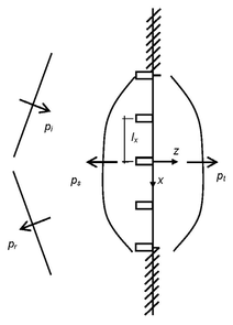 A A A The forced sound transmission of finite periodic plates using a variational approch Jonas Brunskog 1 Acoustic Technology, DTU Electro Technical University of Denmark (DTU), DK-2800 Kgs. Lyngby, Denmark ABSTRACT Many engineering structures consist of plates being periodically stiffened or loaded. Examples can be wooden joist floors, dry walls with wooden or metal beams, or metamaterials for increased sound insulation. Even though some of these structures are well known and thoroughly studied in the past, there lack prediction models that can handle both the finiteness and periodicity in a simple and accurate manner. In two previous attempts, the periodicity of the structure have been tried to be incorporated in a variational technique based on integral-differential equations of the fluid loaded plate, based on [J. Brunskog, JASA 132, 1482–1493, 2012]. These attempts have not worked well: they show a poor fit with measured data. In this paper, this issue is investigated again, and a different tactics is used to incorporate the periodicity, using space harmonics. In this way, the paper try to explain the previous misfit and improve the model. 1. INTRODUCTION In a couple of papers [1, 2] the variational approach of deriving expressions for the sound insulation of single homogenous walls of finite area [3] has been tried to be extended to spatially periodic walls, such as walls reinforced by periodically spaced beams. Another potential use for such a theory would be for metamaterials for increased sound insulation [4, 5]. The first result of these investigations [1], using a line connection between beams and plate, was a disappointment; some results are reproduced in Fig. 1 below. When compared to measured results found in the literature, Northwood [6], the match was poor; the theory showed a too strong influence of the beams, and a too low transmission loss in a large frequency range. In [2] the theory was thus developed further to see if a better agreement with the measured data is found is assuming a resilient point connection instead of a line connection. However, even if the point connection theory results in a better fit to the experimental data, it also includes a sharp transition from the low frequency theory to the high frequency theory, which is not seen in the experimental data. Inspecting the theoretical results in [1,2] it can be noted that periodic effects are not included in the present form of the theory – the influence of the periodic location of the beams is canceled out by the adjoint field when forming the variational functional. This fact can be essential explaining the discrepancies between the present theory and the experimental results. 1 jbr@elektro.dtu.dk In this paper this issue is investigated again, using a different tactics to incorporate the periodicity, using space harmonics. In this way, the paper try to explain the previous misfit and improve the model. The paper presents work in progress, and final results of the new theory is still missing. Some problems with the new approach will be discussed. Figure 1: Examples from the studies in [1] and [2]. Transmission loss 𝑅𝑅 for plaster board wall with line connection theory (red line diamond symbol) as compared to measured results by Northwood [6] (blue line + symbol), theory including no beams (cyan line triangle symbol), and theory with only mass impedance of the beams (green line circle symbol). 2. THEORY The theory in [2] is the starting point for the theory developed here. The impedance operator for a plate reinforced with a periodic array of beams ∞ 𝒵𝒵= 𝒵𝒵 𝑝𝑝 + 𝒵𝒵 𝑏𝑏 𝛿𝛿(𝑥𝑥−𝑚𝑚𝑙𝑙 𝑥𝑥 ) , (1) 𝑚𝑚=−∞ where 𝒵𝒵 𝑝𝑝 is the impedance operator for the plate and 𝒵𝒵 𝑏𝑏 is the impedance operator for the beams. Using the combinations of the pressures acting on the plate, all evaluated at 𝑧𝑧= 0 , the governing equation for the vibrations of the finite wall, see Fig. 2, can be written 𝒵𝒵𝑣𝑣(𝑥𝑥, 𝑦𝑦) = 2𝑝𝑝̂ 𝑖𝑖 𝑒𝑒 −𝑖𝑖(𝑘𝑘 𝑥𝑥 𝑥𝑥+𝑘𝑘 𝑦𝑦 𝑦𝑦) + 2𝑖𝑖𝑖𝑖𝑖𝑖න𝑣𝑣(𝑥𝑥 ′ , 𝑦𝑦 ′ )𝐺𝐺(𝑥𝑥, 𝑦𝑦, 0|𝑥𝑥 ′ , 𝑦𝑦 ′ , 0 )𝑑𝑑𝑑𝑑𝑑𝑑𝑑𝑑 (2) 𝑆𝑆 𝑤𝑤 = Theory ink rib —©— Theory mass rib. 9 Theory no rib —+— NRCC 100 200 400 800 Frequency f [Hz] 1600 3150 Figure 2: The model of a finite wall, located in an infinite rigid baffle in the x-y-plane, at 𝑧𝑧= 0 . The wall consist of a plate and ribs located with a distance 𝑙𝑙 𝑥𝑥 apart. On the left side of the wall is the source side ( 𝑧𝑧< 0 ), the right side is the receiver side ( 𝑧𝑧> 0 ). The present author [3] have developed a variatonal formulation to achieve approximate solutions of eq. (2). The theory is based on a method developed in Morse and Ingard [7], and deeply inspired by the corresponding theory for sound absorbers of finite size, as developed by Thomasson [8]. Following this procedure the variational functional of the problem can be shown to be 𝑉𝑉= 2𝑝𝑝̂ 𝑖𝑖 ∫ 𝑣𝑣(𝑆𝑆)𝑒𝑒 𝑖𝑖(𝑘𝑘 𝑥𝑥 𝑥𝑥+𝑘𝑘 𝑦𝑦 𝑦𝑦) 𝑑𝑑𝑑𝑑 𝑆𝑆 𝑤𝑤 + 2𝑝𝑝 𝑖𝑖 ∫ 𝑣𝑣 𝑎𝑎 (𝑆𝑆)𝑒𝑒 −𝑖𝑖(𝑘𝑘 𝑥𝑥 𝑥𝑥+𝑘𝑘 𝑦𝑦 𝑦𝑦) 𝑑𝑑𝑑𝑑 𝑆𝑆 𝑤𝑤 − ∫ 𝑣𝑣 𝑎𝑎 (𝑥𝑥, 𝑦𝑦)𝒵𝒵𝑣𝑣(𝑥𝑥, 𝑦𝑦) 𝑆𝑆 𝑤𝑤 𝑑𝑑𝑑𝑑+ 2𝑖𝑖𝑖𝑖𝑖𝑖∫ ∫ 𝑣𝑣 𝑎𝑎 (𝑆𝑆)𝑣𝑣(𝑆𝑆 ′ )𝐺𝐺(𝑆𝑆|𝑆𝑆 ′ )𝑑𝑑𝑆𝑆 ′ 𝑑𝑑𝑑𝑑 𝑆𝑆 𝑤𝑤 𝑆𝑆 𝑤𝑤 . (3) In [1,2,3] the test function used was 𝑣𝑣(𝑥𝑥, 𝑦𝑦) = 𝑣𝑣ො𝑒𝑒 −𝑖𝑖(𝑘𝑘 𝑥𝑥 𝑥𝑥+𝑘𝑘 𝑦𝑦 𝑦𝑦) and adjoint function 𝑣𝑣 𝑎𝑎 