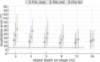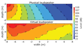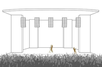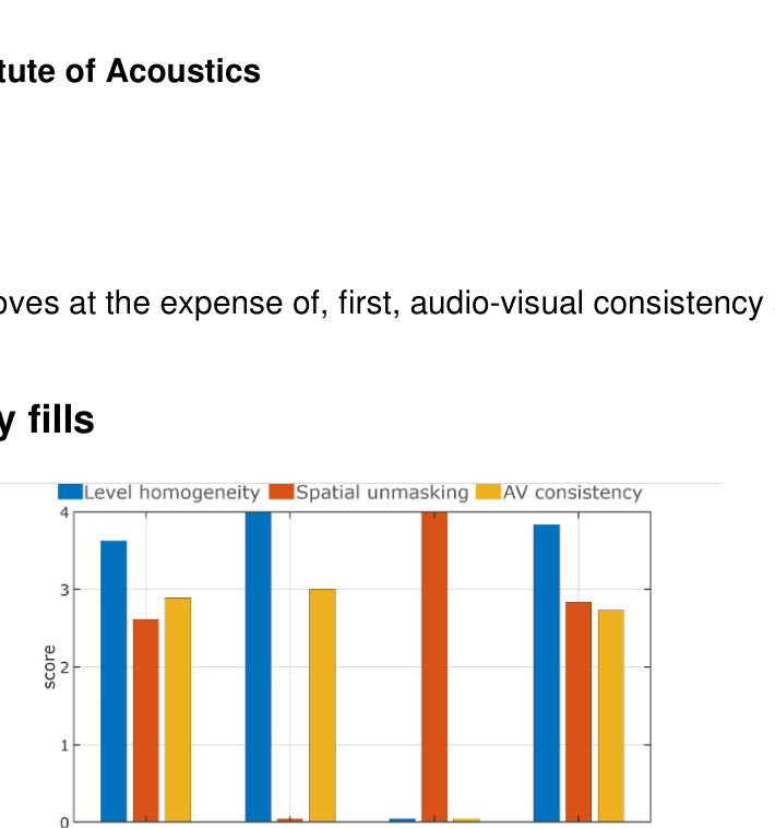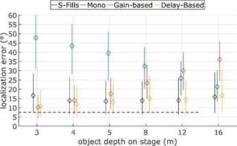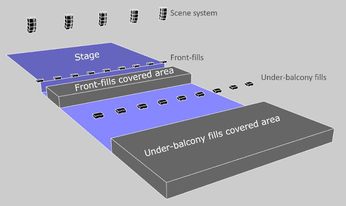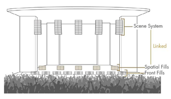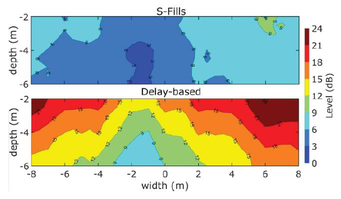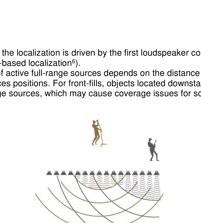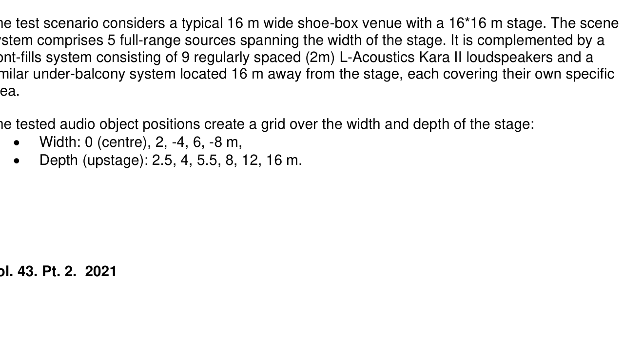 A A A Volume : 43 Part : 2 Proceedings of the Institute of Acoustics SPATIAL RENDERING OVER DISTRIBUTED FILL SYSTEMS IN IMMERSIVE LIVE SOUND REPRODUCTION E Corteel L-Acoustics, Marcoussis, France F Roskam L-Acoustics UK, London, United Kingdom S Moulin L-Acoustics, Marcoussis, France 1 INTRODUCTION Immersive live sound reproduction is an emerging field that aims at providing high quality spatial sound for large audiences in live shows. This entails three major shifts from common practices: 1. transition from channel-based to object-based audio description, 2. use of dedicated immersive audio algorithm to create loudspeaker signals based on the audio objects input channels, the audio objects metadata and the loudspeaker positioning information, 3. adapted loudspeaker system design methodologies. The principal objective of the loudspeaker system design process is that the loudspeaker system covers the entire audience. The coverage is the area over which the loudspeaker system provides a direct sound in an acceptable frequency response variation. In an immersive system, this should be achieved for any possible audio object location, independently of the number of loudspeakers being used. Like classical approaches, the loudspeaker system can be broken into several components: • a principal system that delivers most of the coverage, most of the frequency bandwidth, and most of the spatial rendering capabilities, • a subwoofer system that extends the low frequency capabilities of the principal system in the same coverage area, • additional fill systems that aim primarily at complementing the coverage of the principal system in specific audience areas. Fill systems are classically fed with mono signals, consisting of the sum of all audio object channels, therefore providing limited spatial information for audience members located within their coverage area. This article presents options to restore spatial information within the corresponding area using dedicated loudspeaker system design approaches and immersive audio rendering techniques. First, loudspeaker system design for immersive systems is presented with a specific focus on fill systems that use distributed loudspeakers over a wide audience area (front-fills, under-balcony fills). Second, various spatial rendering algorithms are introduced. Third, an evaluation framework to compare multiple approaches along key quality criteria is presented. Fourth, results are presented and finally discussed, presenting additional benefits of the proposed “spatial fills” approach in terms of time alignment. 2 LOUDSPEAKER SYSTEM DESIGN FOR IMMERSIVE LIVE SOUND REPRODUCTION 2.1 Frontal loudspeaker system design The minimum loudspeaker system for spatial sound reinforcement typically consists in 5 full-range sources located above the stage and spanning its full width. Full-range sources can be individual loudspeakers or line sources, depending on the depth of the audience area, required Sound Pressure Level (SPL) average and distribution, as well as frequency response. Vol. 43. Pt. 2. 2021 Proceedings of the Institute of Acoustics In the L-Acoustics approach for immersive sound reproduction, all full-range sources of the so-called scene system should be configured to maximize their shared coverage area 1 , as can be seen in Figure 1. This shared coverage area defines the area of the audience where audio objects can be precisely localized (spatialized zone). Like so, coverage is assured in a well-defined audience area independently of the position of the audio object. Figure 1: frontal system layout, spatialized zone (cross coverage area of all full range sources of the scene system), and coverage of a typical front-fill system An optional extension system can be used to extend the perceived total width of the sound scene (panorama). It consists of one or multiple full-range sources located on either side of the scene system, configured so that their coverage maximally overlaps with the spatialized zone. The scene and extension systems form an essential component of the principal loudspeaker system which receives the main contributions in a live frontal act. This is where the main performers are located and where most of the acoustical energy needs to be created. All loudspeakers of the principal system should be fed with discrete signals from the spatial sound processing unit to provide the intended spatial information to the audience. 2.2 Fills systems The fill systems are dedicated to complement the principal system and are designated according to the portion of the audience they need to cover and where they are implemented. Different types of fill systems are described in Table 1. Fill system name Audience area Loudspeaker positioning Front-fills, near-fills, lip-fills directly in front of the stage along the stage In-fills directly in front of the stage on either side of stage, pointing inwards Out-fills on either side of the stage on either side of stage, pointing outwards Under-balcony fills below a balcony where the frontal system is physically masked along the edge of the balcony Delay-fills where the principal system cannot provide enough intelligibility or SPL large distance from the stage, separate sources Table 1: fill system types, audience area and loudspeaker positions Full-range sources that comprise In-fills, out-fills or delay-fills systems are covering audience area that have little or no overlap. There is therefore little to no potential to offer spatial rendering, which require combining multiple full-range sources. Vol. 43. Pt. 2. 2021 Proceedings of the Institute of Acoustics Figure 2: number of loudspeakers within 6 dB level difference at each audience position, front-fills (left) and under-balcony fills (right), loudspeakers located at 0m depth, details can be found in section 4.1. On the contrary, distributed fills systems, such as front-fills or under-balcony fills, comprise a distribution of full-range sources over a r