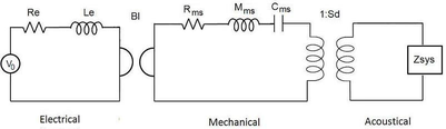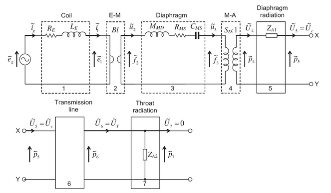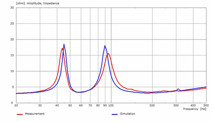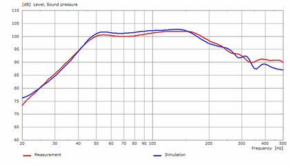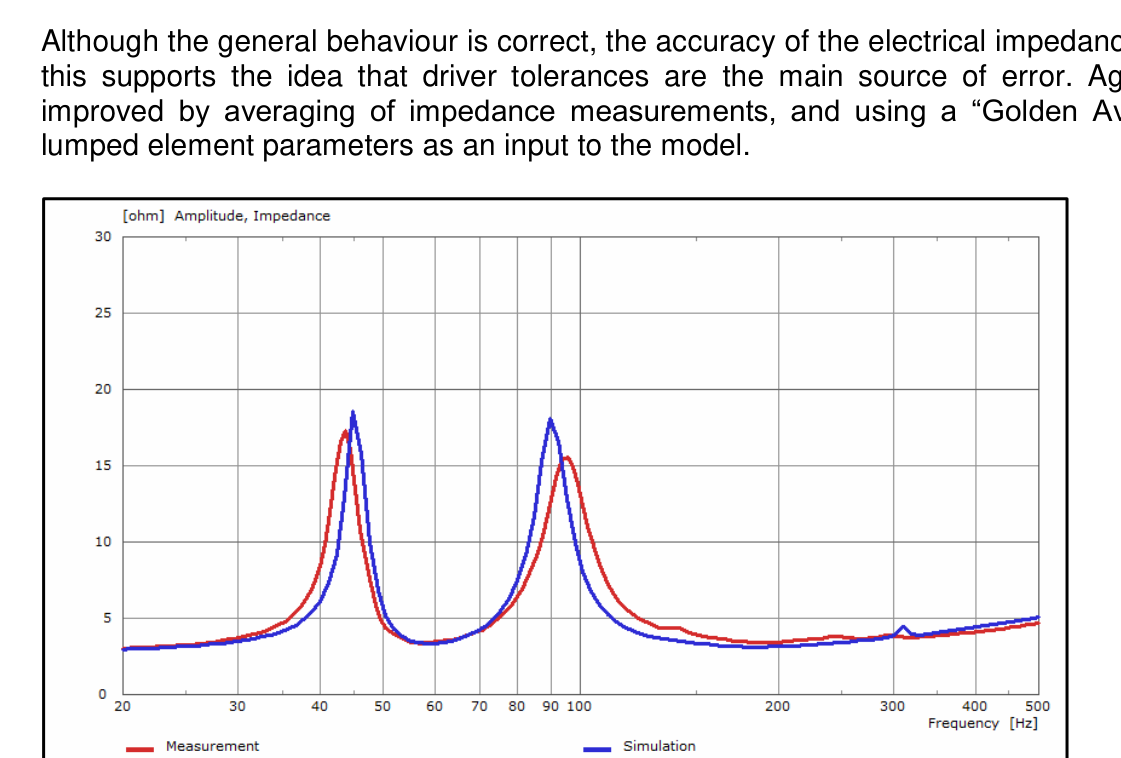 A A A Volume : 43 Part : 2 Proceedings of the Institute of Acoustics MULTIPHYSICS SIMULATION OF A LOW FREQUENCY HORN LOUDSPEAKER J Hipperson Funktion One Research Ltd. UK AJ Svobodnik Mvoid Group, Germany T Nizzoli Mvoid Group, Germany P Feurstein Mvoid Group, Germany 1 ABSTRACT This paper gives insight into advanced modelling procedures for horn loaded bass loudspeakers. It will be shown that this approach will correctly predict the performance of a non-trivial design, purely from the 3D geometry and lumped element transducer parameters, in the sense that it predicts both the resonant and horn loading effects of the design. A special focus will be on post-processing following the paradigm of virtual measurement, resulting in high resolution directivity patterns for further analysis in array modelling and room acoustics predictions. All results are compared to real measurements and evaluated in terms of accuracy. 2 BACKGROUND 2.1 MOTIVATION Modern sound reinforcement systems typically consist of two or more main loudspeaker arrays, augmented by a number of dedicated low frequency loudspeakers or subwoofers. The crossover point is typically in the range of 60-100Hz. Historically, all loudspeakers in a sound reinforcement system were horn loaded for maximum electroacoustic efficiency, including low frequency loudspeakers. This was due to the limitations of early power amplifiers, which could rarely deliver more than 100W into 8Ω. Modern developments in amplifier technology such as pulse width modulation (PWM), and improved materials and venting design in transducers has resulted in low frequency horn loudspeakers (or bass horns) largely being replaced by low sensitivity (95- 99dB/2.8V/1m) high power (>2000W) dual 18” bass reflex loudspeakers. However, some manufacturers and enthusiasts continue to develop and use bass horns for their high efficiency and subjective audio quality. It is not uncommon for bass horns to have up to 10dB higher sensitivity than bass reflex subwoofers, which can result in significantly reduced power consumption. Bass reflex loudspeakers are relatively well understood, with a large body of literature on modelling and design. However there is less literature on the theory and performance of bass horns, despite their invention some years prior. Consequently there are some myths surrounding their behaviour, particularly the idea that bass horns somehow project, or “throw” sound further than direct radiating loudspeakers. The goal of this work is to develop a highly accurate predictive model for the sound pressure level (SPL) distribution of large arrays of bass horns, incorporating any additional effects or behaviours unique to bass horns. Therefore, it is important to establish what these effects are, if they exist. Both measurement and modelling can be employed to investigate. Vol. 43. Pt. 2. 2021 Proceedings of the Institute of Acoustics 2.2 MODELLING OPTIONS – LUMPED ELEMENTS, TWO PORTS Bass reflex loudspeakers are typically modelled using an equivalent circuit lumped element model. This is a simple and computationally cheap approach, with good accuracy as all acoustic components are substantially smaller than the wavelengths of interest. Bass horns however, are typically larger, and the horn length is often in the range of a quarter wavelength of the lowest frequency it is designed to reproduce. This means that a lumped element model is no longer applicable, as wave behaviour must be considered. A possible solution to this is a hybrid lumped element – two port model, coupling a lumped element transducer model to cascaded two port conical horn sections to approximate the profile of the horn. From Mapes-Riordan (1993): Diaphragm Diaphragm radiation Rus Cust i, Z| 0-0, OTN] mS fr Transmission Throat line radiation 0-0. 0,=0, Xoo > To. fo. \Za2 ™ 6 7 oY The cascaded transmission matrices for each horn section are contained within the “black box” labelled 6 in the schematic below adapted from Beranek/Mellow (2012): Sealed Chamber Cascaded Two Port Matrices Horn Radiation Figure 2: Hybrid lumped element/two port model for a horn loudspeaker, adapted from Beranek/Mellow Vol. 43. Pt. 2. 2021 Proceedings of the Institute of Acoustics The advantage of the hybrid lumped element/two port method is that it is computationally very cheap, and very fast to run. The disadvantage is that it needs a lot of fine tuning and empirical testing to incorporate the numerous non-ideal behaviours of a real horn. Another disadvantage is the added complexity of coupling horn sections with both positive and negative expansion rates. Figure 3 shows an attempt at modelling a 21” driver bass horn. The general behaviour is more or less correct, but the overall accuracy to the real data is poor, particularly the 10dB peak at the upper end of the response. Furthermore, it is rarely trivial to work out exactly where the model is going wrong. Bass Horn Lumped Element/Two Port modelled response 120 115 110 Sensitivity (dB) 105 100 95 90 85 80 Frequency 20 200 2.3 FINITE ELEMENT METHOD Figure 3: Modelled response of dual 21” bass horn In 2021, computation is cheap, which opens the door to powerful, but computationally inefficient methods such as the Finite Element Method (FEM) and Boundary Element Method (BEM) for loudspeaker modelling. As a very simple overview, both approaches function by dividing a geometry into subdomains based on a “mesh”, then solving a particular partial differential equation for each subdomain in the mesh, and collecting the results for the complete geometry. In Acoustics, the equation describing the behaviour of sound waves is the Wave Equation. Although the wave equation is continuous and the mesh of subdomains is discrete, it is assumed that the solutions to the wave equation are well approximated by a finite sum of test functions. The FEM software attempts to minimise the error between the exact solutions and approximate solutions. The principle of t