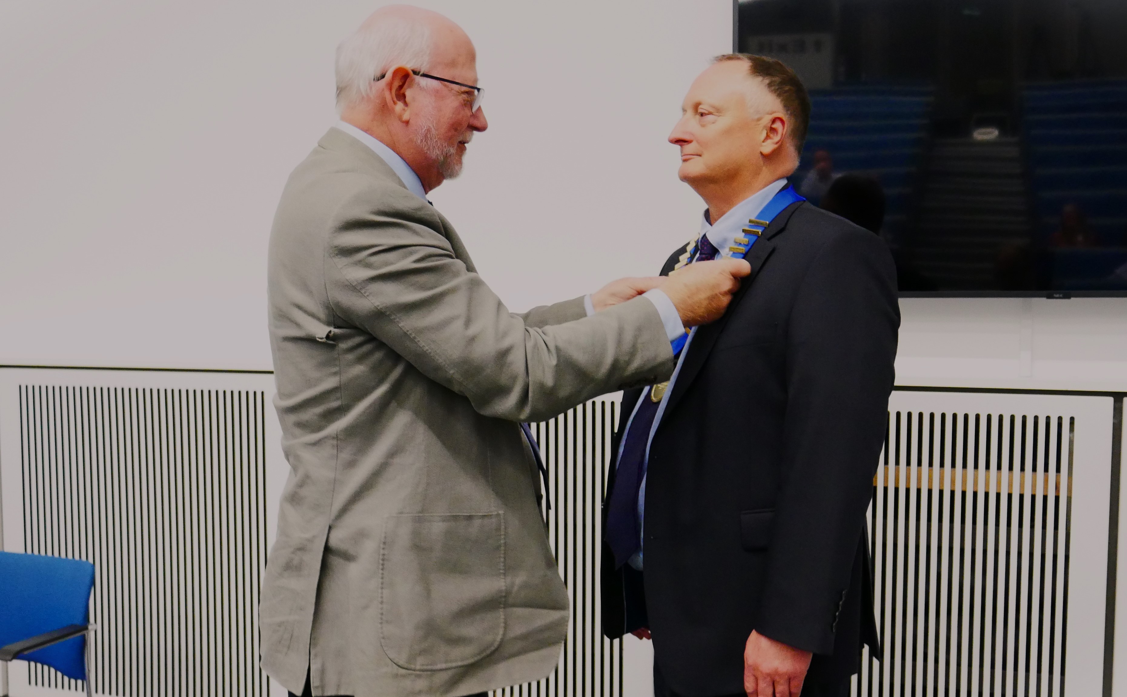 Caption: Outgoing President Alistair Somerville (left) presents the official chain of office to incoming President David Waddington (right)..