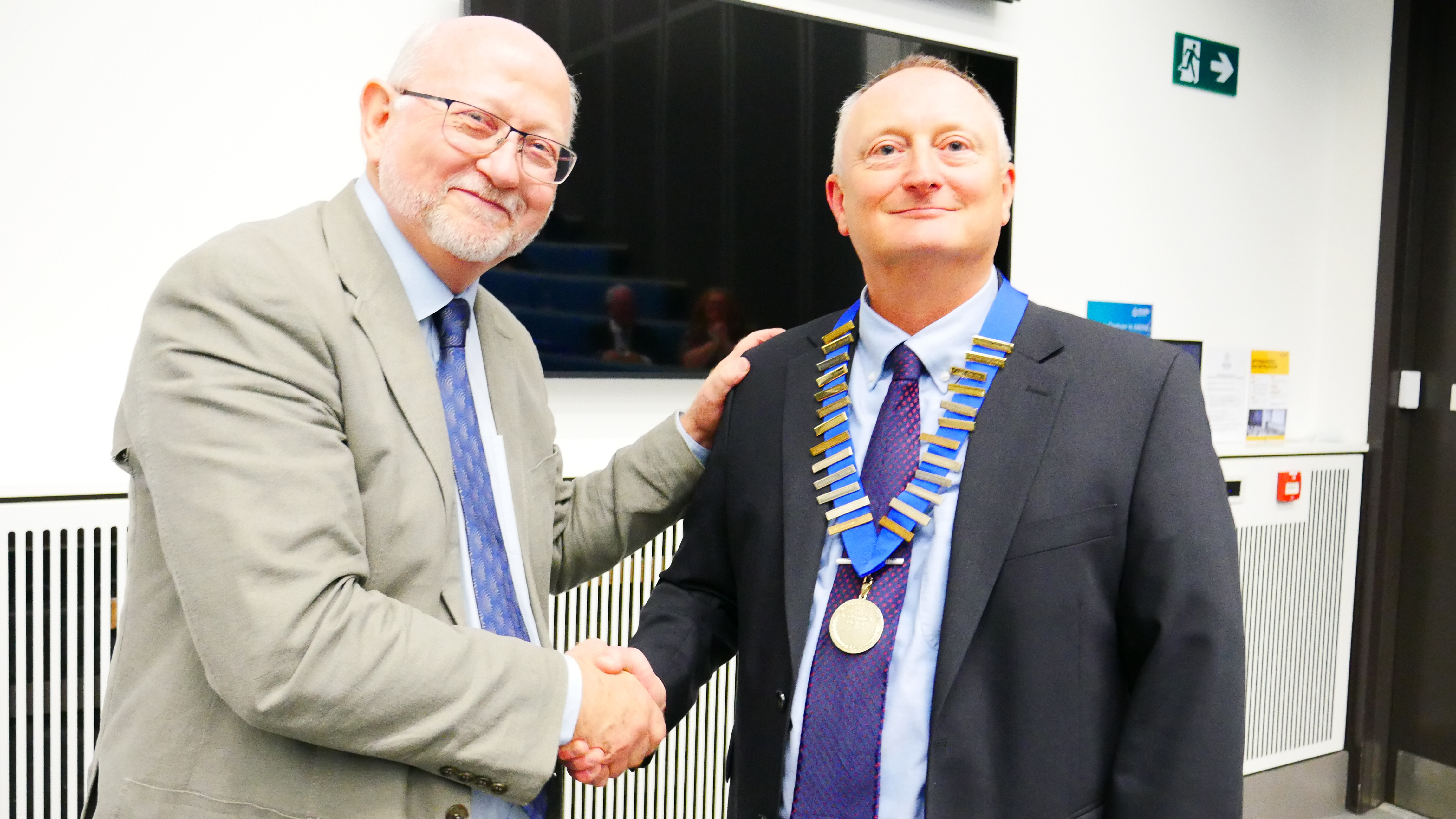 Alistair Somerville (left) presented the official chain of office to David Waddington (right).